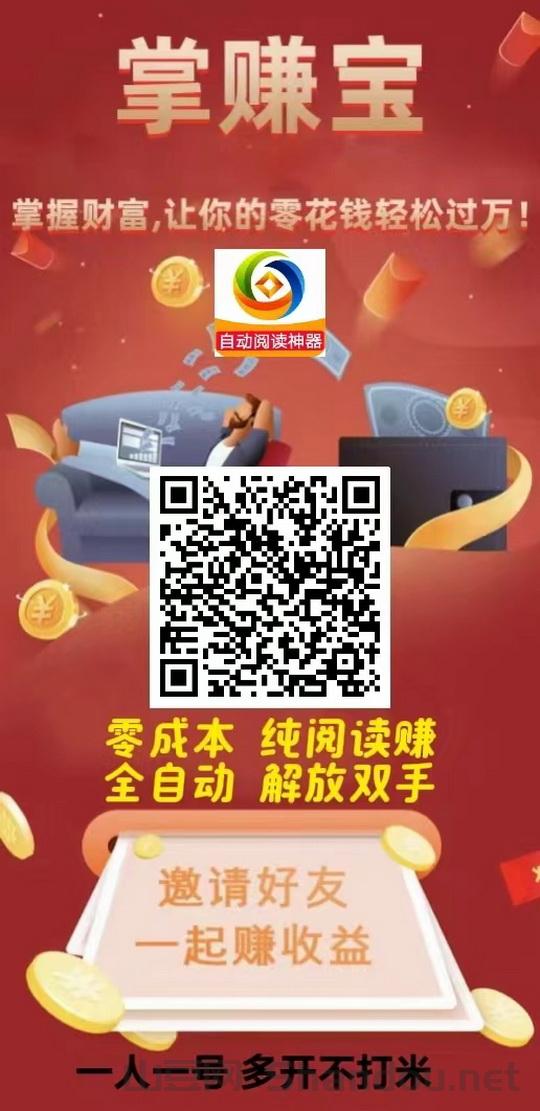 掌赚宝自动阅读项目,注册直接送5米,可直接提走,完全躺着赚收益,单号日收益30-100+,项目原理: 我们躺赚宝会在微平台接取大量的文章唰阅读量,公z号投票,刷广告等任务,躺赚宝系统会自动完成这些任务,并为大家带来不错的收益,完全免费,欢迎加入!